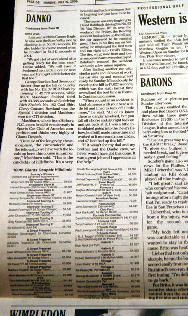 The Times Leader newspaper covers northeastern Pennsylvania. Here you see a listing of the race times for the 100th Anniversary Giant's Despair Hill Climb in July of 2006.